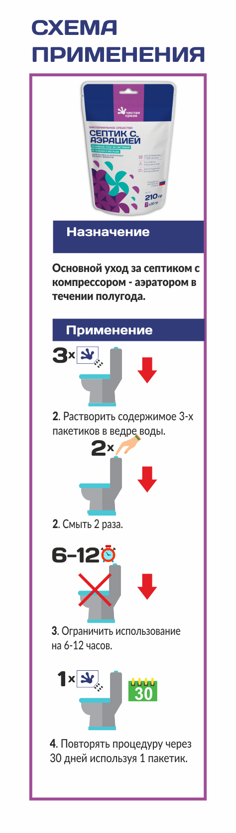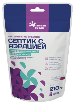 Устраняет неприятный запах, разлагает органику, фекалии, жиры, бумагу, крахмал, мочевину, белок. Снижает необходимость очистки и авто-ассинезации. Создан Российскими учеными на основе микроорганизмов постоянно присутствующих в почвах России. Содержит высокую концентрацию (2Х10⁹ КОЕ) 5 видов спор аэро и анаэробных бактерий. Композиция бактерий подобрана с учетом особенностей эксплуатации септиков с аэрацией: повышенный доступ кислорода в одной части системы и ограниченный в другой. Препарат нетоксичен для человека, животных, растений.